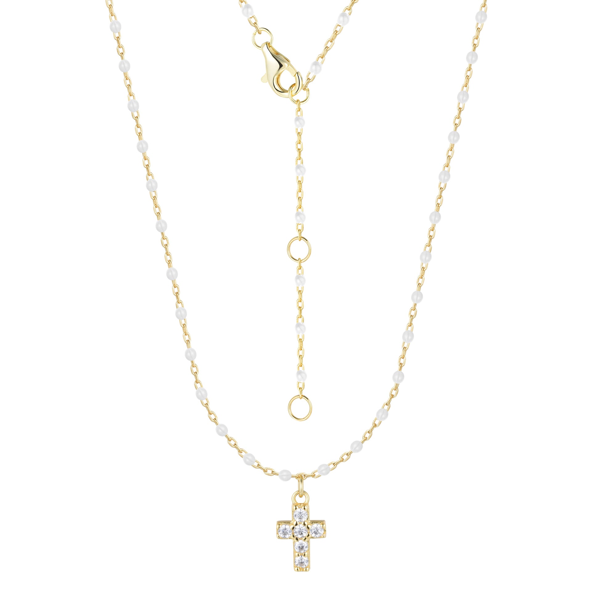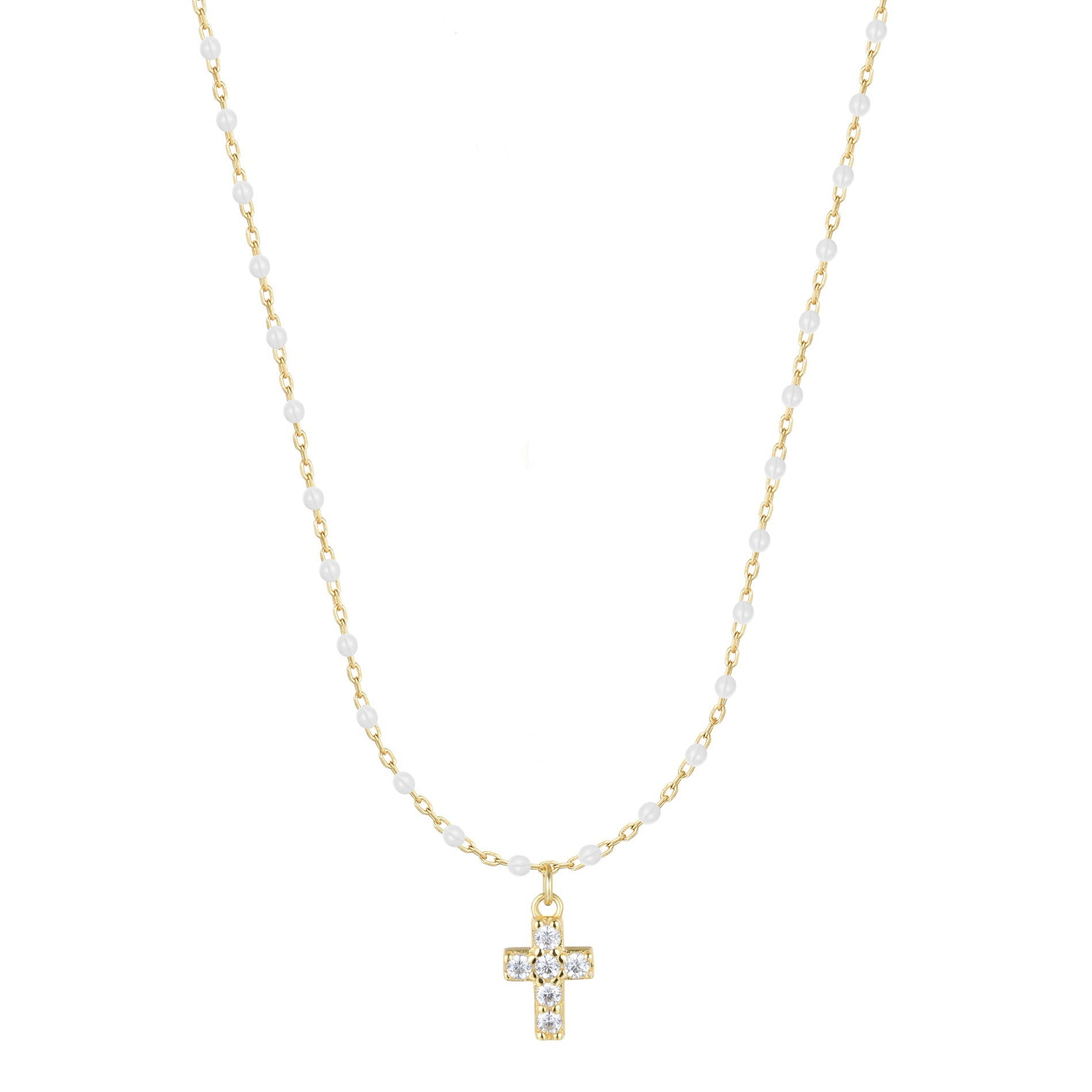 AMARI MINI CROSS WHITE BEADED GOLD NECKLACE