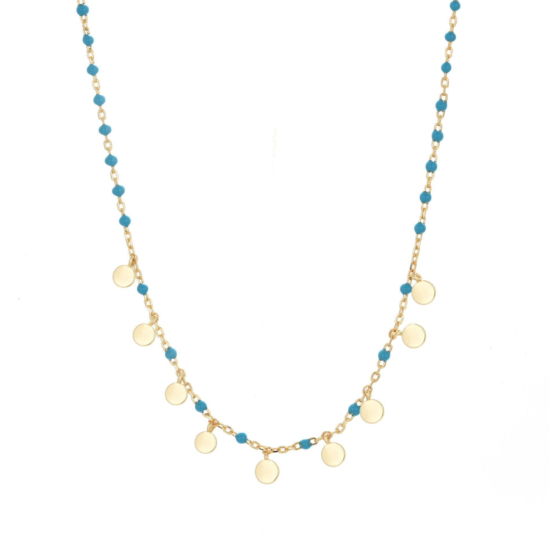 This beautiful necklace has a combination of chain links and small turquoise beads. The chain features a series of evenly spaced turquoise beads, adding a pop of color to the piece. Hanging from the chain are small, flat, circular rose gold discs, which dangle freely and add a playful, whimsical element to the necklace. The combination of the bright turquoise beads and the discs creates a striking and stylish contrast.