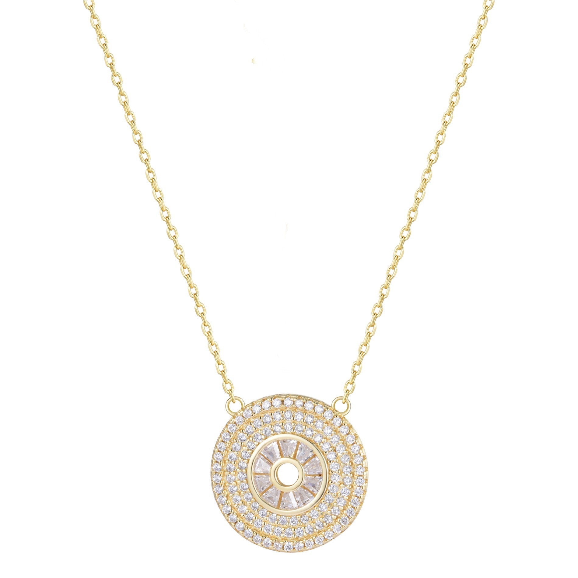 This stunning necklace has a concentric circle design, with a central circular opening surrounded by layers of crystals. The innermost circle features baguette-cut crystals arranged radially around the central opening. Surrounding this are two more layers of small, round white crystals, creating a sparkling, elegant effect.