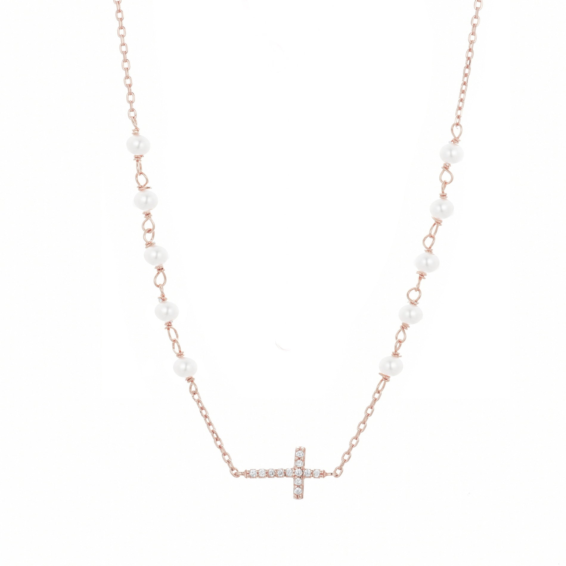GABRIELLA CROSS PEARL BEADED ROSE GOLD NECKLACE