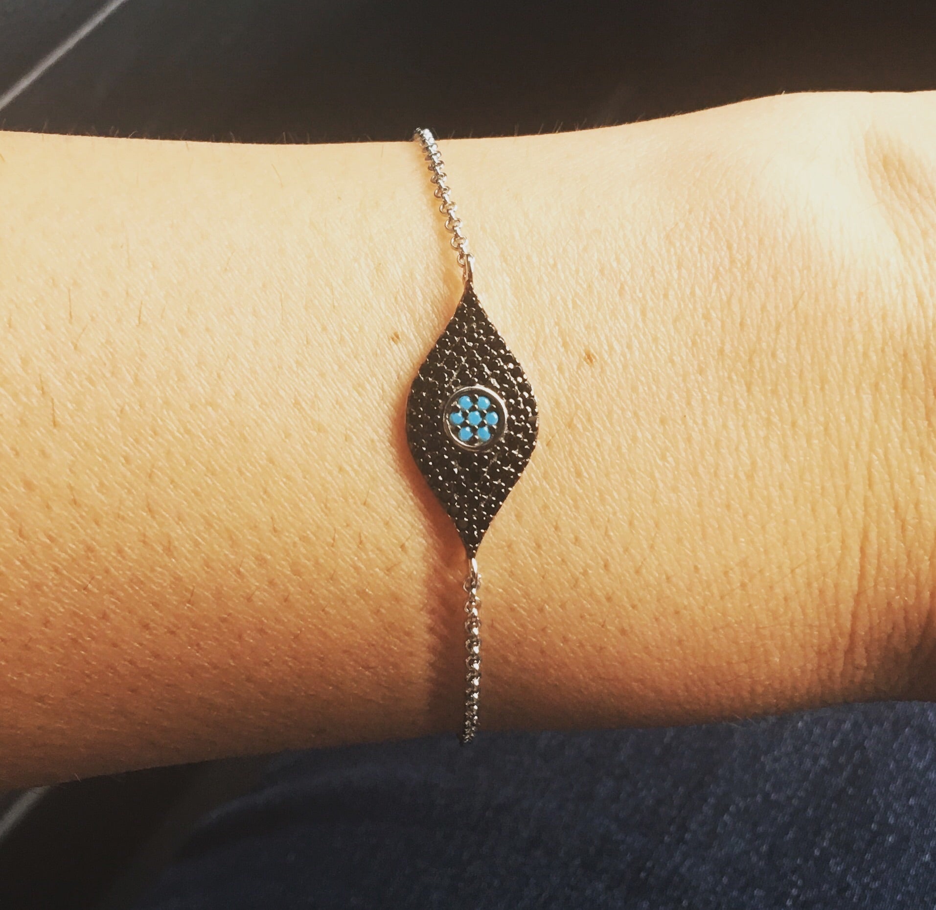 Handcrafted protective eye bracelet. Stunning and unique in design, this omen of luck and protection is surrounded by exquisite black stones with turquoise stone setting.