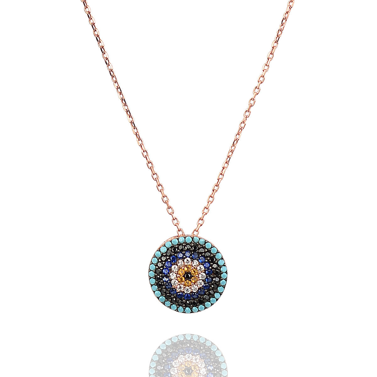 This celestial Nile necklace features a stunning Evil Eye pendant perfect for layering. The eye is encrusted in sapphire, turquoise, crystal and yellow pave© CZ stones. Both pendant and chain are Sterling Silver 925 with rose gold plating. Chain length is approximately 45cm.