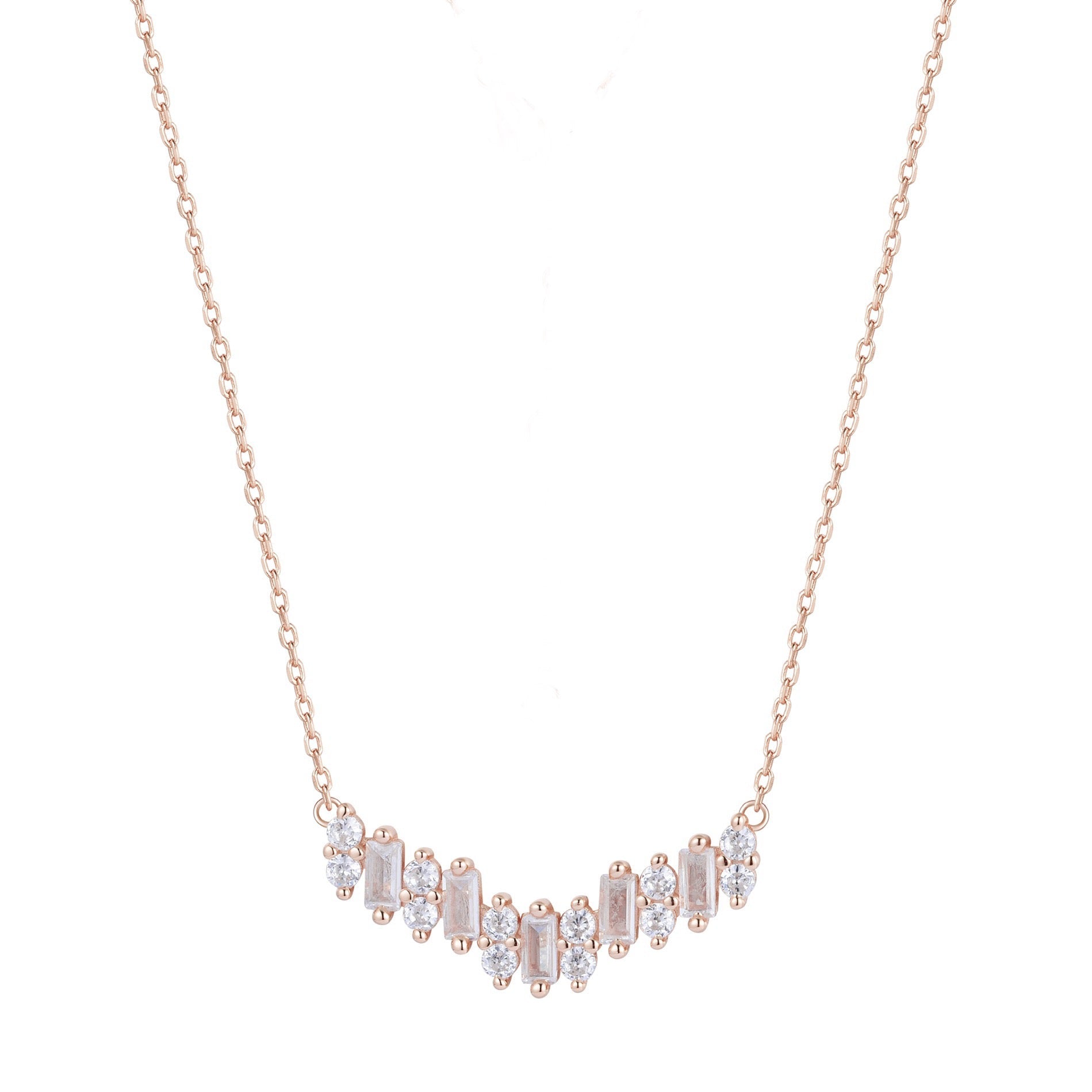 This stunning handcrafted necklace features a central design composed of alternating rectangular and round white crystals. The rectangular stones are baguette-cut and set vertically, interspersed with clusters of smaller round crystals. The arrangement creates a gentle, symmetrical curve, giving the necklace an elegant and modern look.