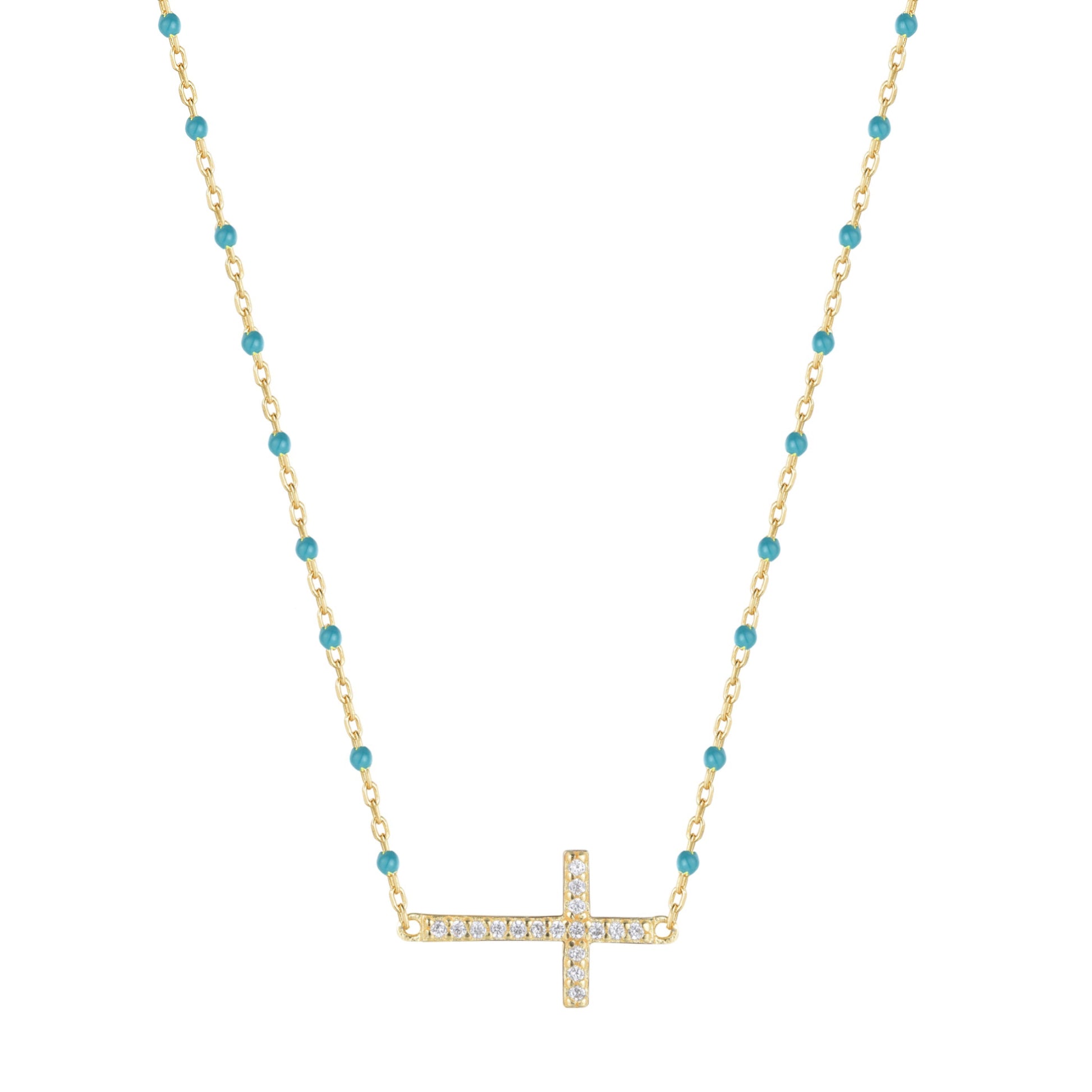 This stunning necklace features a central side cross encrusted with crystals. The necklace contains mini blue beads giving it a rosary like design. This piece can be worn as a symbol of protection and layered with our other delicate necklaces for an effortless stylish look.