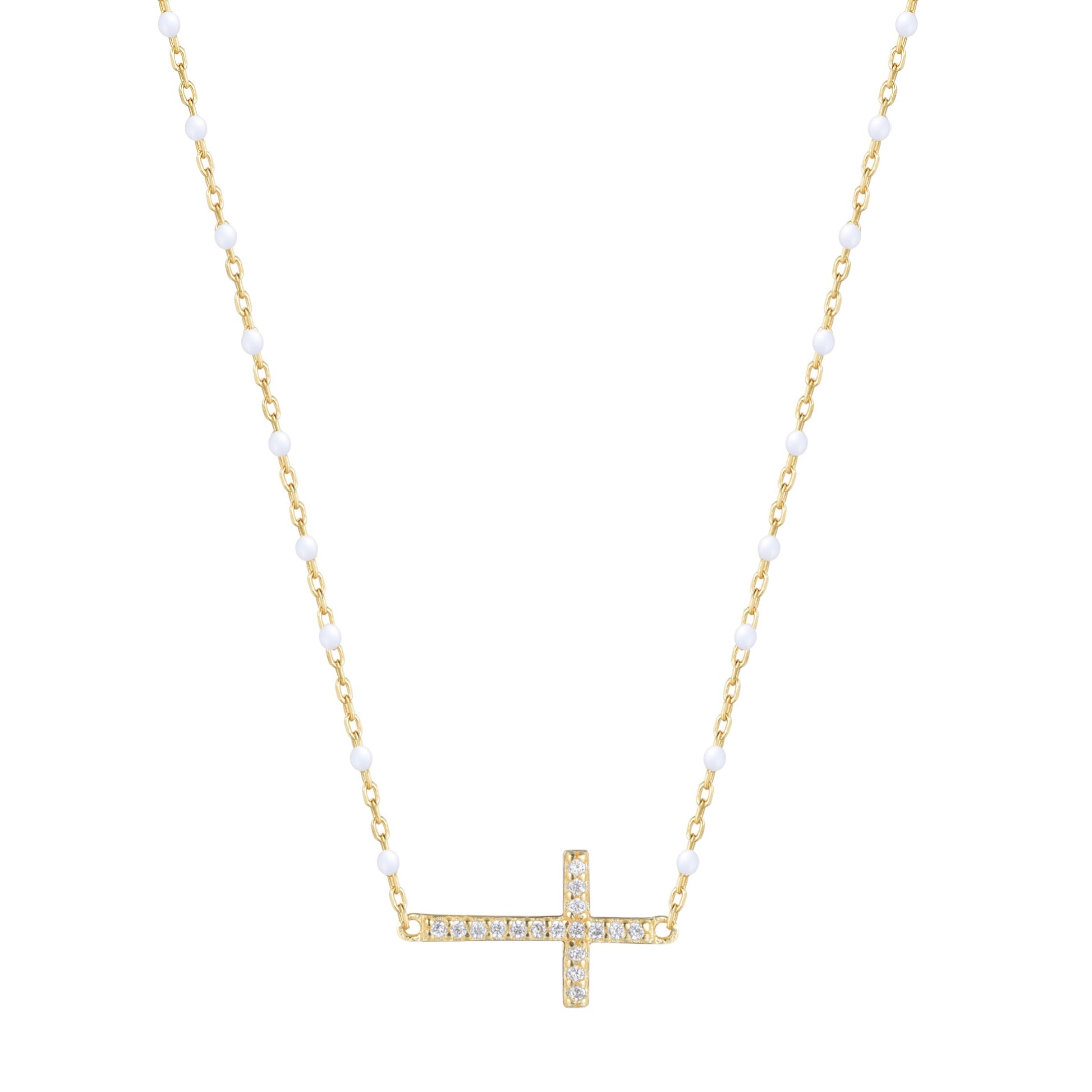 This stunning necklace features a central side cross encrusted with crystals. The necklace contains mini white beads giving it a rosary like design. This piece can be worn as a symbol of protection and layered with our other delicate necklaces for an effortless stylish look.